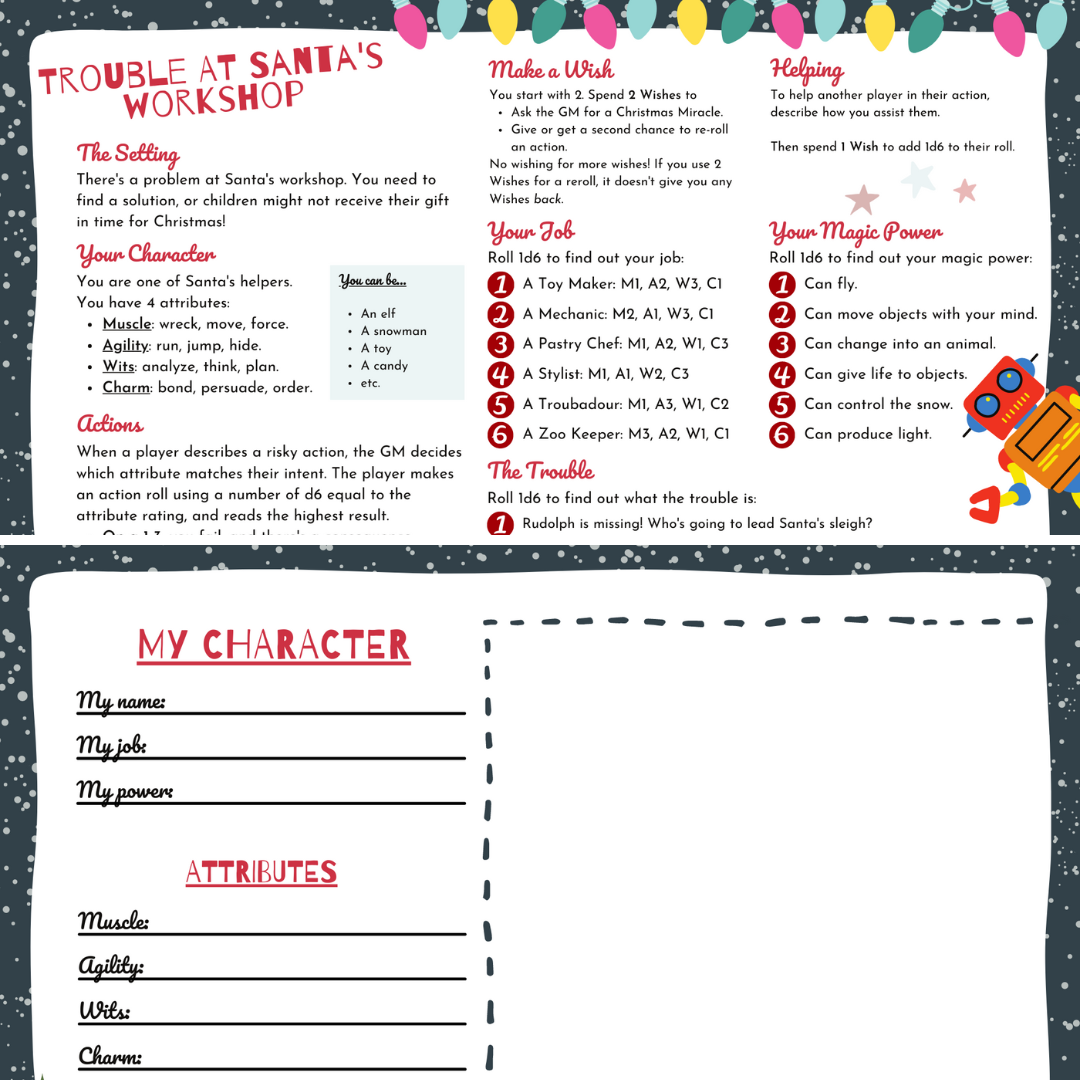 Trouble at Santa's Workshop is a kid friendly mini tabletop role-playing game where you play as Santa's helpers to help prevent some trouble from happening to Christmas!